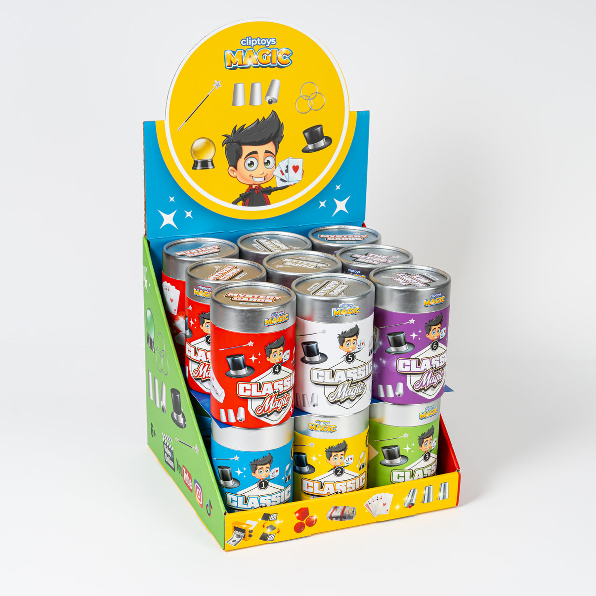 Oplev magien – saml, lær, forbløf! 1 trick i hver sæt samt en online kode , som giver adgang til 25 bonus tricks. Saml de 6 forskellige versioner. Fra 6 år. Grøn - Pengemaskine. Lilla - Den Hemmelige Boks. Rød - Mystiske Kort. Blå - Magiske Svampebolde. Hvid - Bægre & Bolde. Gul - Illusionsboks.