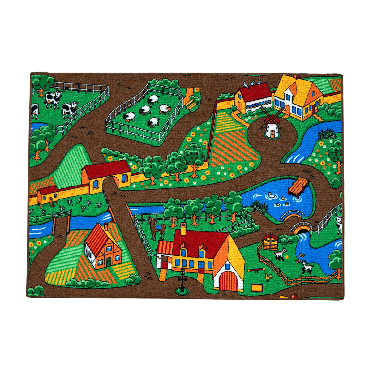 Med en spændende kombination af marker, stier og gårdbygninger er tæppet ideelt til små eventyrere, der elsker at udforske bondegårdslivet. Det passer perfekt i børneværelset eller legerummet og skaber en hyggelig og legende atmosfære. Overfladen er lavet af polyamid, mens undersiden er skridsikker takket være latex, så tæppet ligger stabilt under leg. Det er nemt at rengøre med en støvsuger og en fugtig klud.