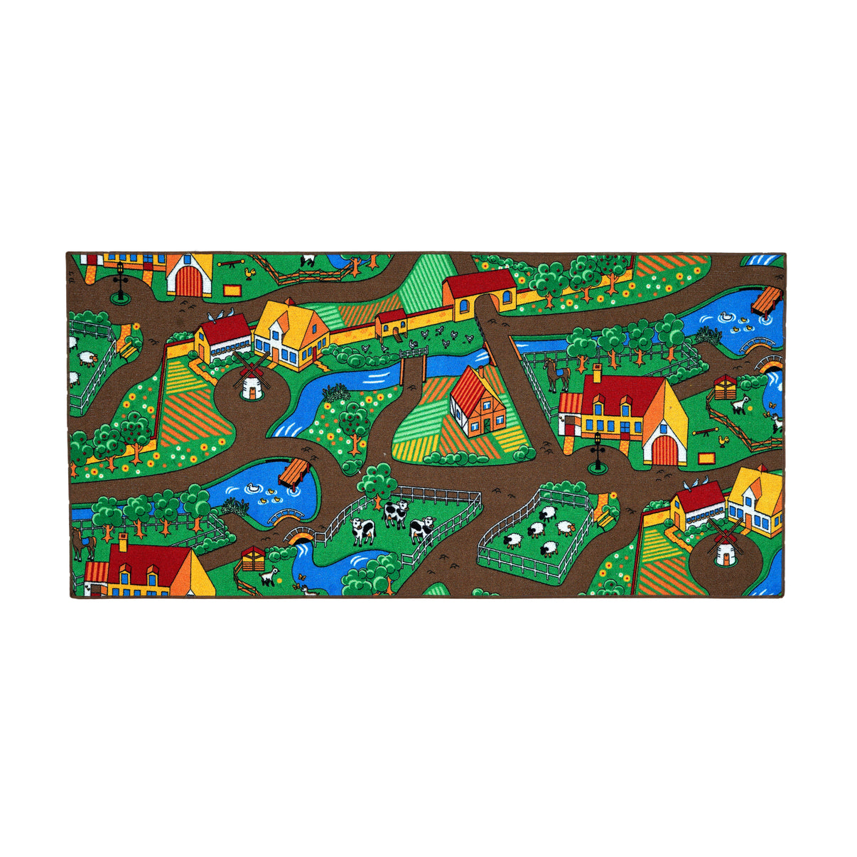 Med en spændende kombination af marker, stier og gårdbygninger er tæppet ideelt til små eventyrere, der elsker at udforske bondegårdslivet. Det passer perfekt i børneværelset eller legerummet og skaber en hyggelig og legende atmosfære. Overfladen er lavet af polyamid, mens undersiden er skridsikker takket være latex, så tæppet ligger stabilt under leg. Det er nemt at rengøre med en støvsuger og en fugtig klud.