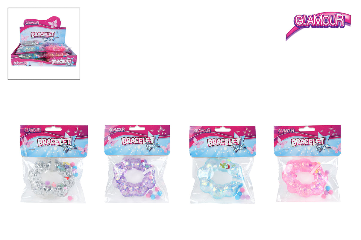 "Glitrende armbånd fyldt med blød sukkergel – både smukke at have på og utrolig satisfying at klemme på!