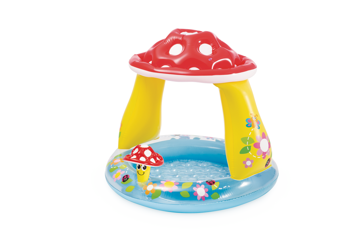 Sød, oppustelig babypool med farvestrålende tag formet som en fluesvamp. Poolen tilbyder den perfekte blanding af vandpjask i haven og skygge for den skarpe sol. Den bløde, oppustelige bund sørger for, at baby sidder trygt og behageligt. Poolen måler 102 x 89 cm og rummer 45 liter. Inkl. 1 reparationslap. Velegnet fra 1-3 år - dog under opsyn af voksen.