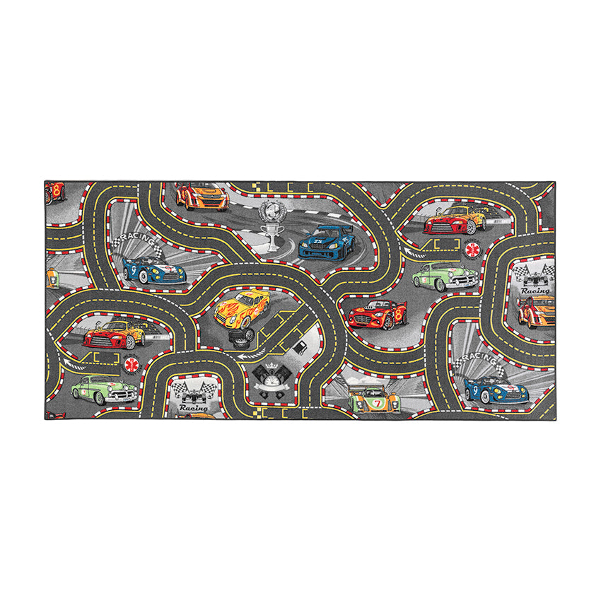 Træd ind i en verden af fart og spænding med Rebel Roads Racerbane Legetæppe! Dette farverige og detaljerede tæppe bringer klassiske racerbiler og snoede racerbaner til live – perfekt til at inspirere dit barns fantasi og kærlighed til hurtige løb. Med skarpe sving, lange strækninger og actionfyldte detaljer er tæppet ideelt til små bilentusiaster. Det passer perfekt i børneværelset eller legerummet og skaber en energisk og sjov atmosfære. Overfladen er lavet af polyamid, mens undersiden er skridsikker takket være latex, så tæppet ligger stabilt under leg. Det er nemt at rengøre med en støvsuger og en fugtig klud. Giv dit barn en verden af racerløb med Rebel Roads Racerbane Legetæppe! Mål: 95 x 200 cm.