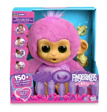 Fingerlings Care ‘n’ Cuddles Interaktiv Babyabe er den sødeste ven, som de mindste kan tage sig af. Harper er en nuttet, lyserød babyabe med blød pels, et krammevenligt krop og et hjerte, der lyser i regnbuens farver. Med over 150 lyde og reaktioner kan børn fodre deres babyabe med sutteflasken, vugge den i søvn, give den et kys, lade den lave saltomortaler, svinge og meget mere. Når det er sengetid, kan nattelysfunktionen berolige børnene, så de nemmere falder i søvn. Indeholder 4 sjove spil og 4 tilbehørsdele: en flaske, en sut, en hagesmæk og en rangle. Fra 3 å