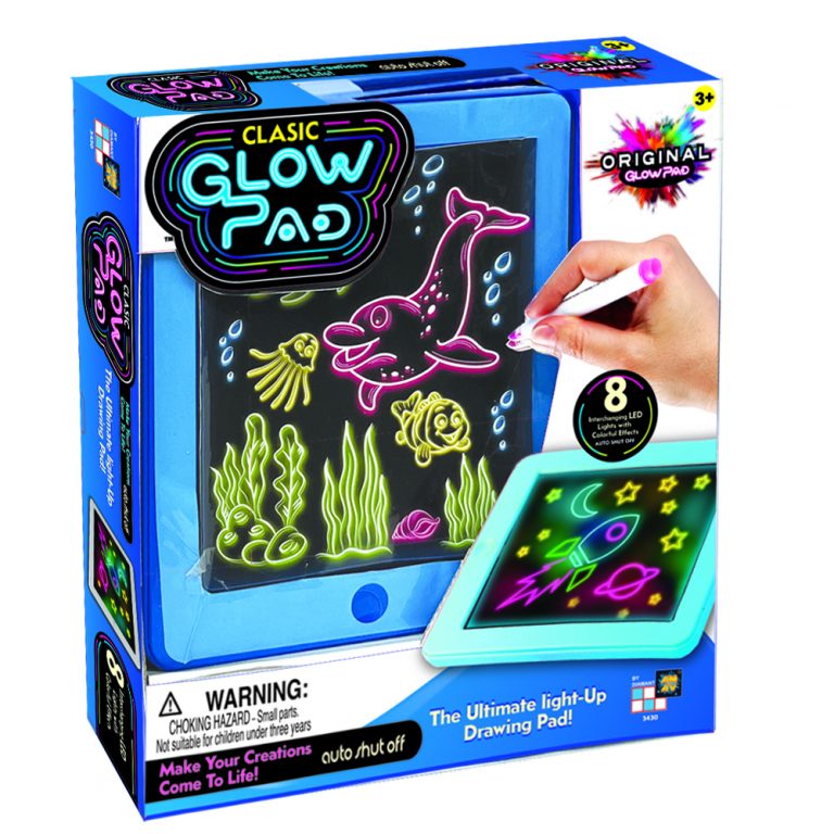 Original Glow Pad - oplev den mest innovative og revolutionerende oplyste LED-tegnetavle. der også kan fungere som en natlampe til børneværelset. Lad dit barns seneste kreationer komme til live i mørket med denne fantastiske tegnetavle. Tegnetavlen har 8 skiftende farver. Til sættet medfølger 2 specielle tuscher i blå og pink. samt klud til at vaske tavlen ren med efter brug. Tavlen bruger 3 x AAA-batterier (medfølger ikke). Fra 3 år.