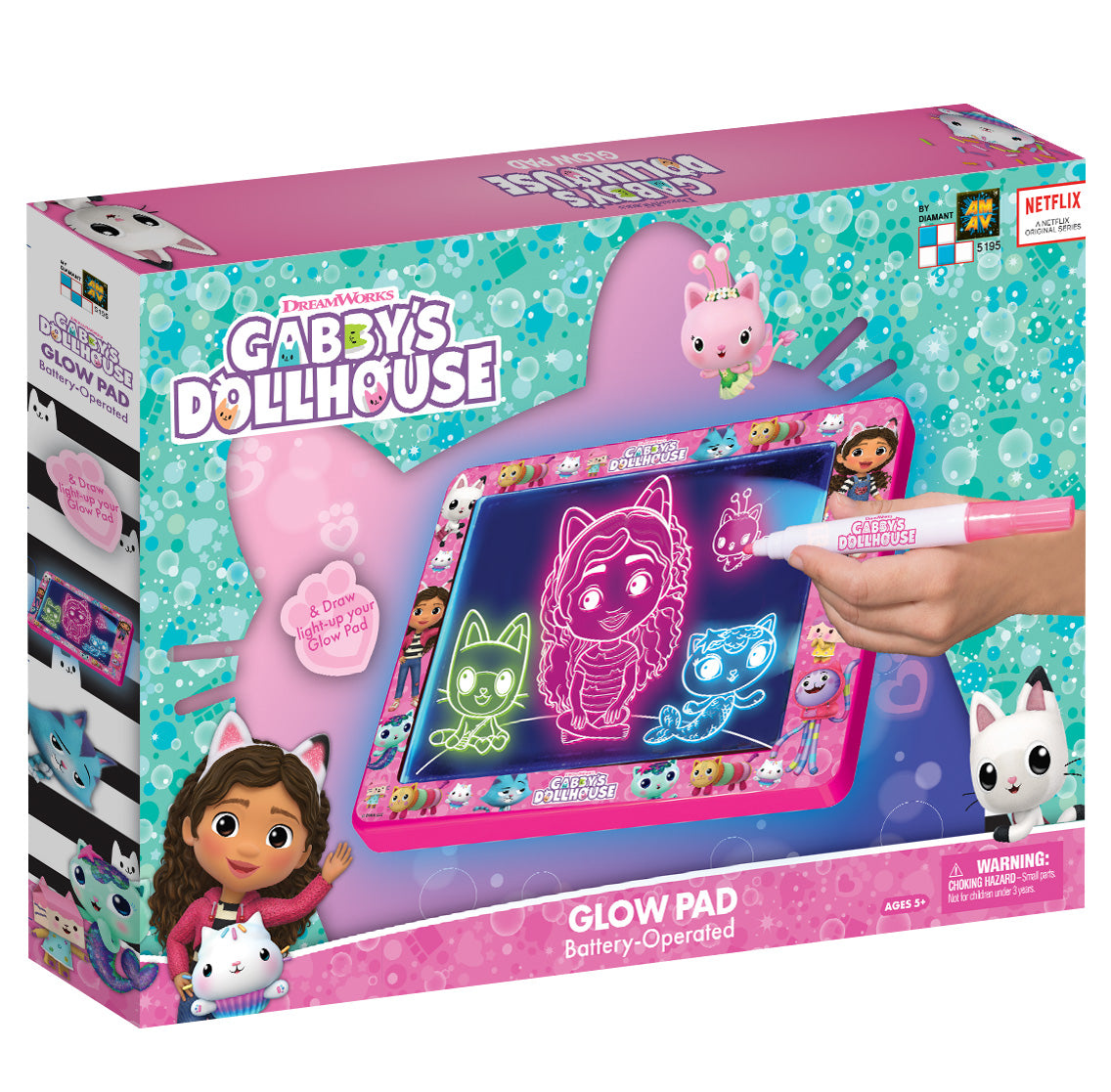 Gabby’s Dollhouse Glow Pad – Tegn med magisk lys! Træd ind i en lysende verden fuld af sjov og kreativitet med Gabby’s Dollhouse Glow Pad! Med dette batteridrevne tegnebræt kan børn tegne deres yndlingsfigurer fra Netflix-serien og se dem lyse op i flotte farver. Brug den medfølgende pen til at skabe lysende kunstværker på skærmen – og vis dem frem i Gabby-stil! Perfekt til små fans. der elsker at tegne. lege og bruge fantasien. Dekorer. tegn og oplys dine egne eventyr med Gabby og hendes kattevenner. Tegn & lys op – igen og igen! Anbefales fra 5 år.