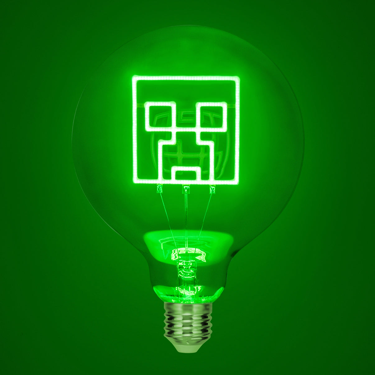 Opgrader din hverdagsbelysning med denne Minecraft Creeper LED Neon-pære. LED-glødetråden i denne dekorative pære er formet som den snigende Creeper-mob. Du kan skrue den ind i en hvilken som helst Edison lampefod. Så snart du trykker på kontakten. vil et levende grønt skær tilføje et glimt af farve til dit hjem. Creeper LED Neon-pæren er en fantastisk måde at sætte et Minecraft spin på belysningen i dit soveværelse eller opholdsrum. Glaspære med formet LED-neondesign. G125. E27 pære med Edison skrueholder.- Officielt licenseret Neon LED-pære passer til Neon LED-lamperne!- Størrelse: 18 x 13 x 13 cm